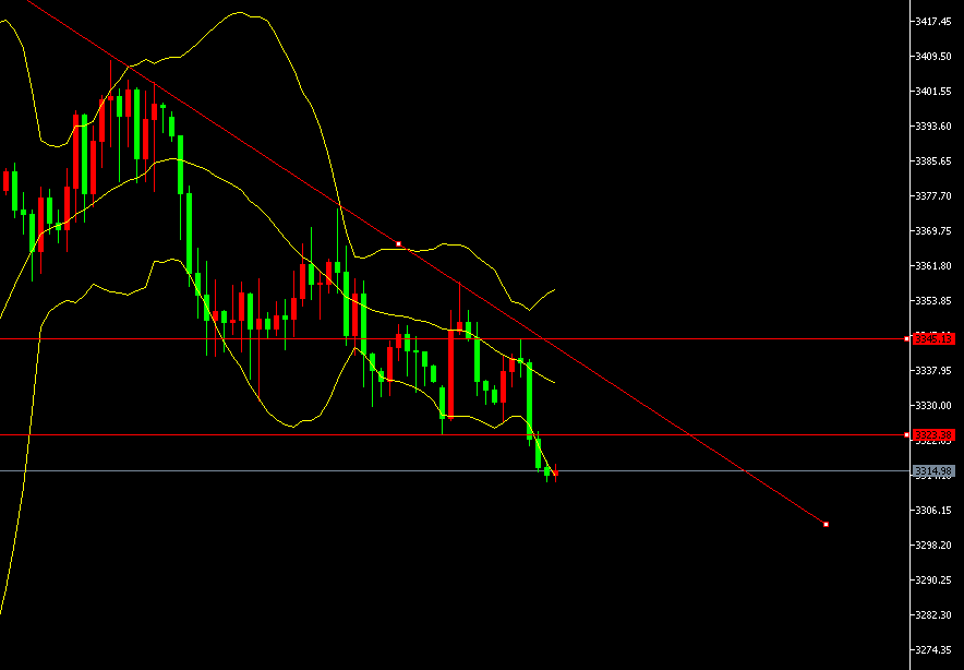4小时图台阶震荡弱势下跌当中,小周期走弱。破低点3323是今日的阻力点,昨日的3345空单底仓继续持有看至3300下方,今日在3320-3318附近适当加仓进空防守在3330即可目标进一步下看3300-3280.4小时台阶弱势中有待进一步加速放量,昨日是慢跌,还有放量式的下挫,力度大一点可看至3250一带,空间值得期待。