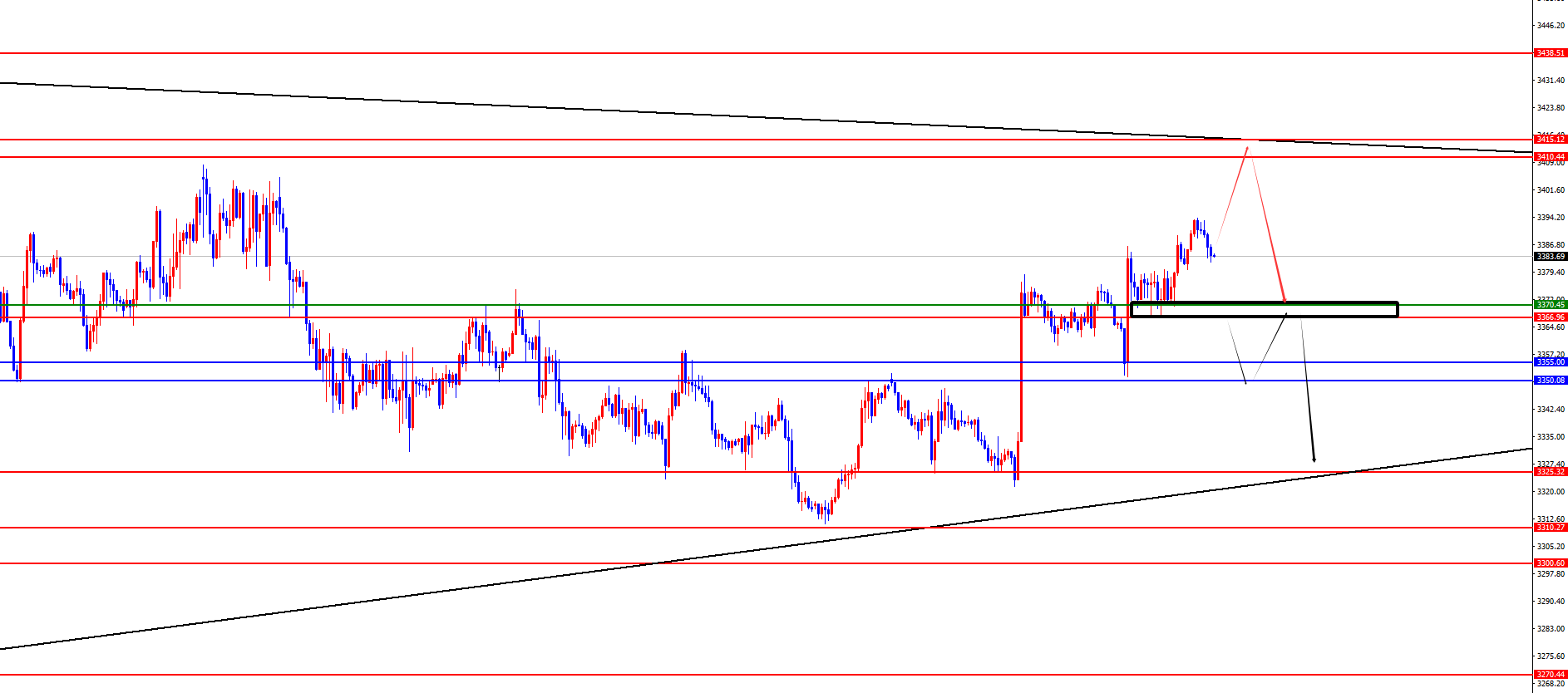 黄金3367-70为分水岭,不破前关注冲高3410-3415区间空,如若提前下破分水岭则有望提前打开下行表现