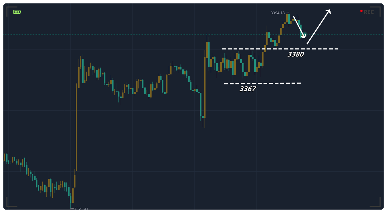 多头防守线关注3370位置,这是昨日晚间十点后的起涨点,偏强的行情,回撤不会跌破起涨点位置。