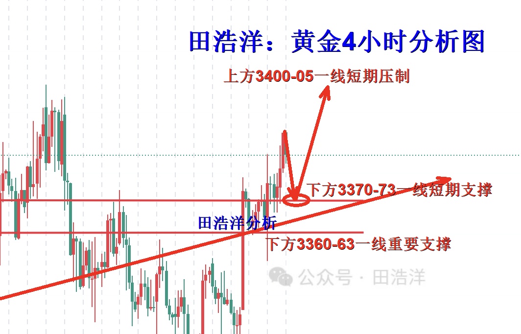 从4小时分析来看,晚间下方支撑关注3370-73附近,日内回踩依托此位置继续主多顺势看涨不变,短期多头强势分界线位于3360附近,日线级别企稳此位置上方继续保持回踩低多节奏不变,顺势参与为主,逆势空单需谨慎。具体操作策略我会在盘中提示,及时关注。