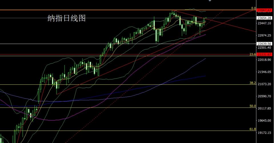 纳指市场昨日开盘在23405.7的位置后行情先拉升给出23505.17的位置后行情美盘开始时段先回落给出23364.17的位置后行情强势拉升,日线最高触及到了23665.48的位置后行情整理,日线最终收线在了23641.33的位置后,日线以一根下影线稍长于上影线的大阳线收线,而这样的形态收尾后,今日行情延续多,点位上,今日23530多止损23470,目标看23660和23720和23770和23800.