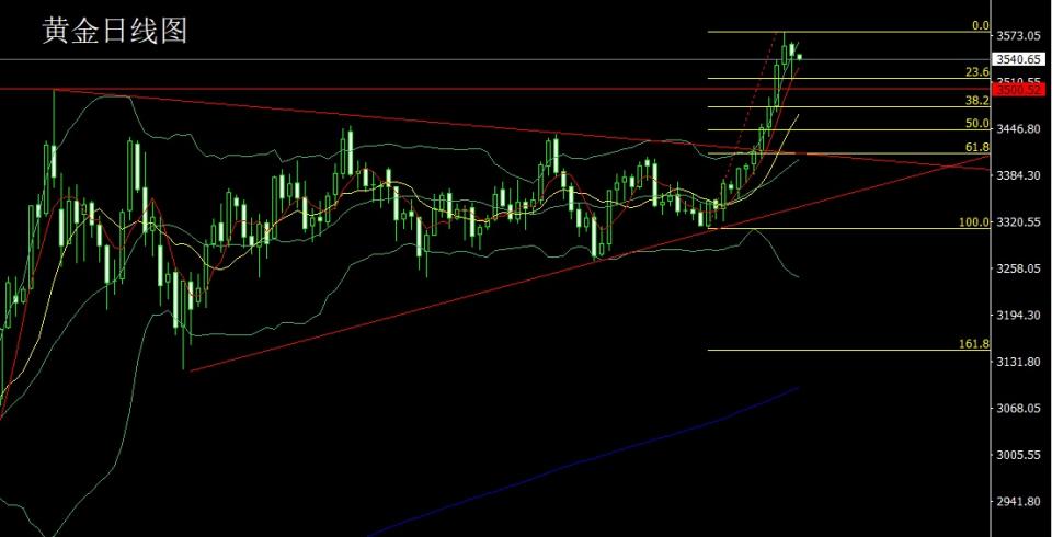 黄金市场昨日区间整理,早盘开盘在3561的位置后行情小幅拉升给出3564.8的日线高点后行情强势震荡回落,日线最低给到了本轮斐波那契的23.6支撑和日线级别5日均线的共同作用拉升,日线最终收线在了3545.7的位置后,日线以一根高位锤头形态收线,而这样的形态收尾后,在技术上今日必须要破前日高点,否则锤头变吊颈行情将进入盘整期,点位上,下方3325和3322的多和上周3368-3370的多和3377和3385多减仓后止损跟进在3450,今日先回落给出3523多保守3520多止损3517,目标看3545和3550和3562和3574.