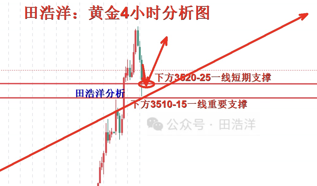 从目前黄金走势来看,下方支撑关注3520-25一线短期支撑,重点关注早间回调位置3510-15一线重要支撑情况,3500一线是多头的最后防线,回踩依托此位置继续主多顺势看涨不变,短期多头强势分界线上移至3500关口,日线级别企稳此位置上方继续保持回踩低多节奏不变,逆势空单一律不参与。具体操作策略我会在盘中提示,及时关注。