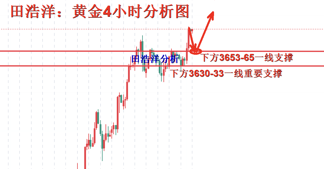 从4小时分析来看,下方支撑关注3655-65一线附近,日内回踩依托此位置继续主多顺势看涨不变,短期多头强势分界线3630-33一线关口,日线级别企稳此位置上方继续保持回踩低多顺势看涨节奏。操作上以回踩做多为主。具体操作策略我会在盘中提示,及时关注。