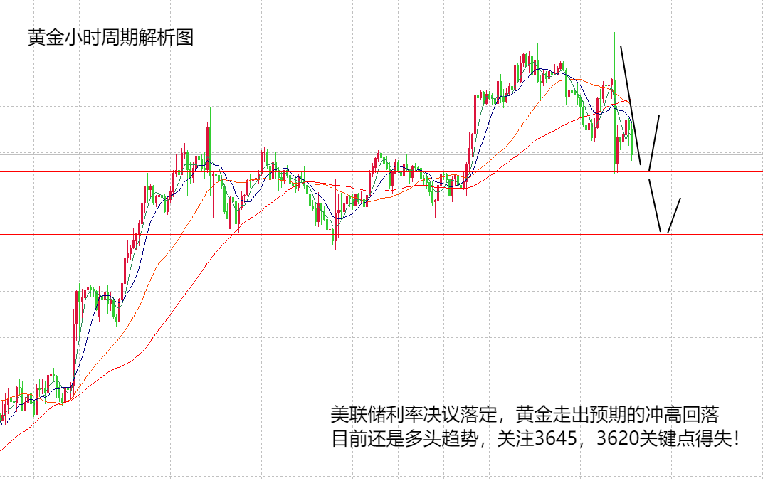 日内行情还是要强调,暂时黄金的多头趋势没有变,主体还是看涨,但中期依旧有调整的风险,所以,交易的话,尽量等待回落做多为主。经过本周,周一,周二,周三的涨跌,黄金目前在两次试探3707高点,两次试探后都出了较大回落力度,特别是午夜美联储公布利率决议后,市场买预期的情绪落定,黄金反而下跌至3645低点,因此,基本可以确定,短期内黄金再难继续走高,甚至是破位新高。那么,近期黄金大概率会是一个震荡调整的走势,不用过分看利率决议后的行情。从技术面来看,日线在高位收阴,但是没有破位单边均线支撑,因此,还不能确定黄金能走出转势力度,顶多是目前有转弱变化,形成高位震荡,下方强弱关键点在3620,跌破3620后日线连阴,破位单边均线,才能看大跌空间。H4目前布林收口,均线粘合,非常明显的震荡走势,布林下轨和60日均线的支撑点在3635附近,此点位不破,也难拉开布林下轨,形成单边大跌。午夜黄金冲高回落,最低在3645附近,所以,下方的支撑点非常明确,依次可以看3645,3635,以及3620关键支撑点,在大趋势不变的情况下,按照回落到关键支撑点就可以做多的原则看涨,上方关注3675,3690,3710。周四,周五大概率还是以多头趋势的高位震荡来看。