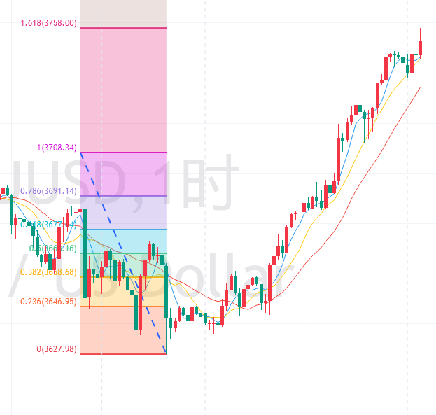 昨日上涨70+的波动,其中仅出现几次小的回调修正第一次到3696回调至3685,第二次3719到3708,第三次3728到3712,连续三次的修正基本上就是2-3个小时完成,并且伴随着快速的回落后现反弹。表示多头较为强势,下方买盘较多。对于单边上涨行情无法判断是尾声还是开始,此时去做多,个人是怕多到山顶上了。