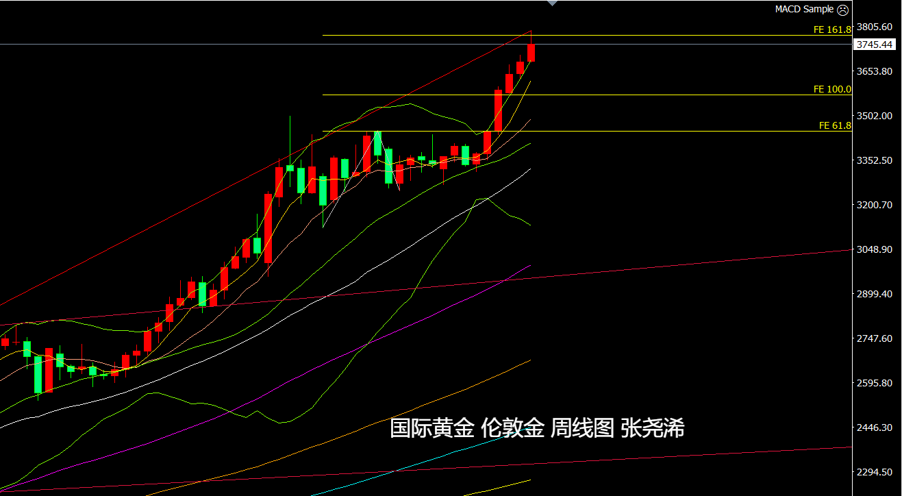 周图,金价自去年开涨攀升以来,如期第4次回踩中轨线支撑,并再度向上攀升,且不断触及给出的看涨目标位,虽目前多头在目标阻力位附近有所减弱和回撤,短期面临一定调整回落走低行情,但整体的看涨趋势依然未有改变,故此,如有进一步调整,下方5-10周均线也是再度入场看涨机会,但如继续反弹运行在阻力位附近或上方收线,则可继续跟进看涨。