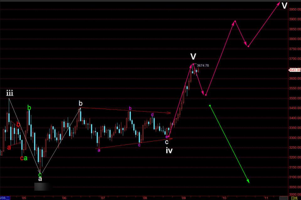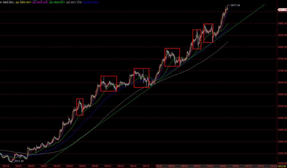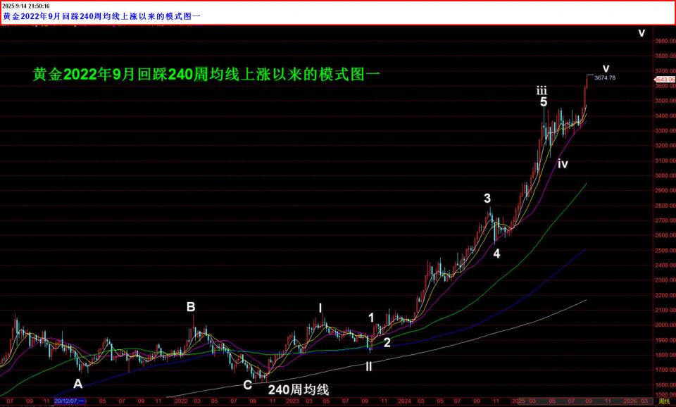 2025年9月14日文章《【格物金融趋势文章684】黄金走势延升,走势关键抉择》给了模式图一,基本观点就是如果突破3674的话就是白色V延长走势,那样的话走势要冲3950/4000的可能,只是没想到此番上涨这么连续。