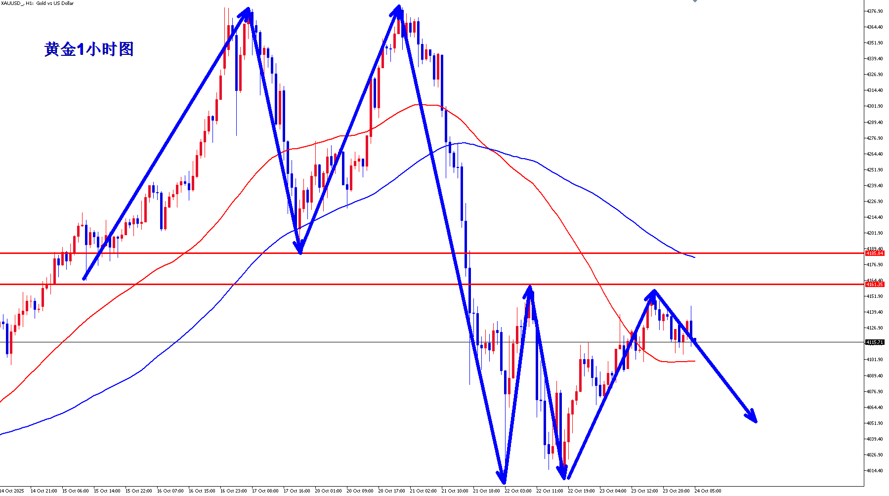 黄金1小时依然承压1小时双顶压制,黄金1小时继续在双顶的颈线位下方震荡运行,黄金还是继续保持震荡,晚上CPI数据如果低于预期,那么美联储降息预期将会增加,那么可能会给黄金多图形成支撑,不过在没有形成向上突破之前,继续看大区间震荡。