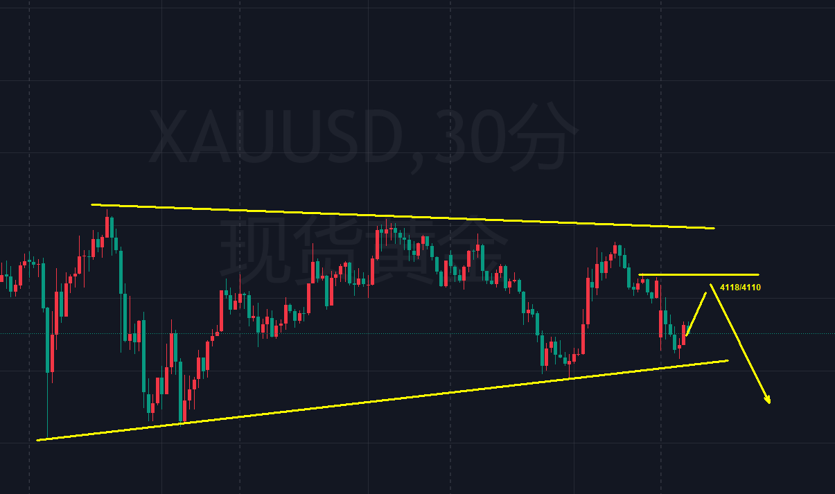 短线方面,今日操作思路仍以回落高空为主,反弹空。暂时关注4110-4118美元区域(早间反弹高点与前期起跌口),这里作为日内反弹空的主要压制点。当然日内的反弹幅度或许不会那么大,毕竟做空一定是越弱越好,反弹越弱下行的空间才会更大,这里就要结合亚盘的形态,欧美盘再考虑激进跟进!