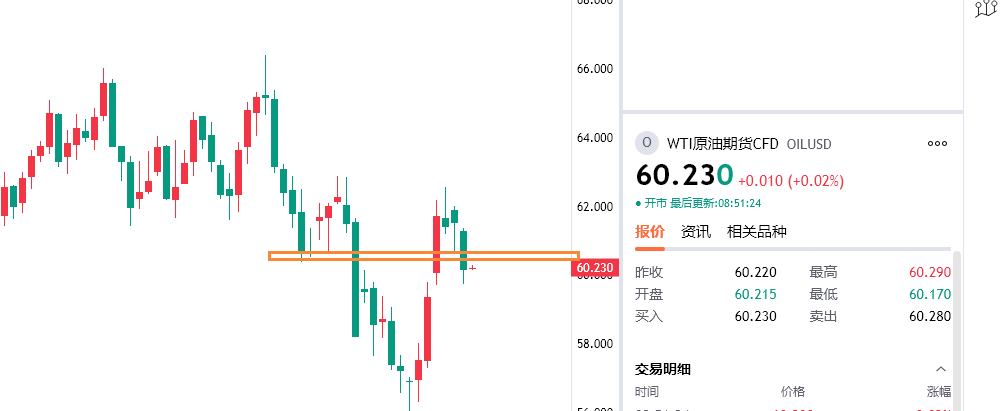 原油反弹在60.8附近空,防守61.5,目标看59/58一线