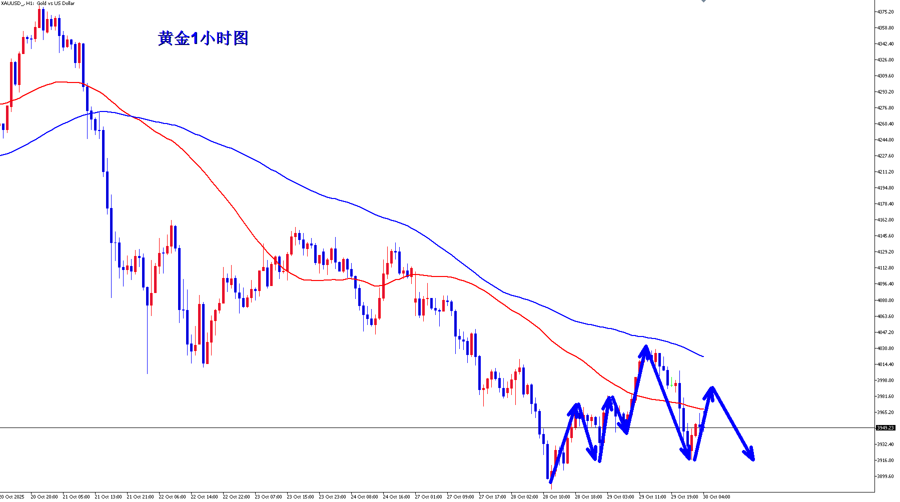 黄金1小时均线还是继续死叉向下的空头排列,而且现在黄金也重新回落到了均线下方,黄金仍旧是空头更偏强势一点,黄金昨晚数据之后冲高4007之后很快就快速回落,黄金早盘承压4000一线的压制还是继续逢高空为主,黄金多头并未站稳4000一线,黄金空头更胜一筹。