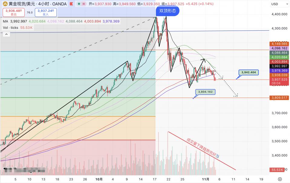 技术方面,随着隔夜黄金跌下关键3970-60支撑,价格的弱势已经非常明显,4小时级别的20MA下穿该级别半年线,且有进一步跌穿MA200均线的迹象,成交量的缩量趋势自10月21日延续至今(图),可以认为是有效下行信号。