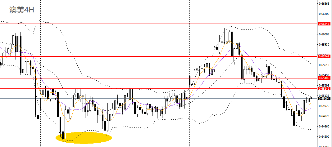 澳美收锤子阳线,守住0.6440一线支撑,4小时空头动能减弱,有望延续回升,多单可继续持有,后市预计将上探0.6520,0.6540。