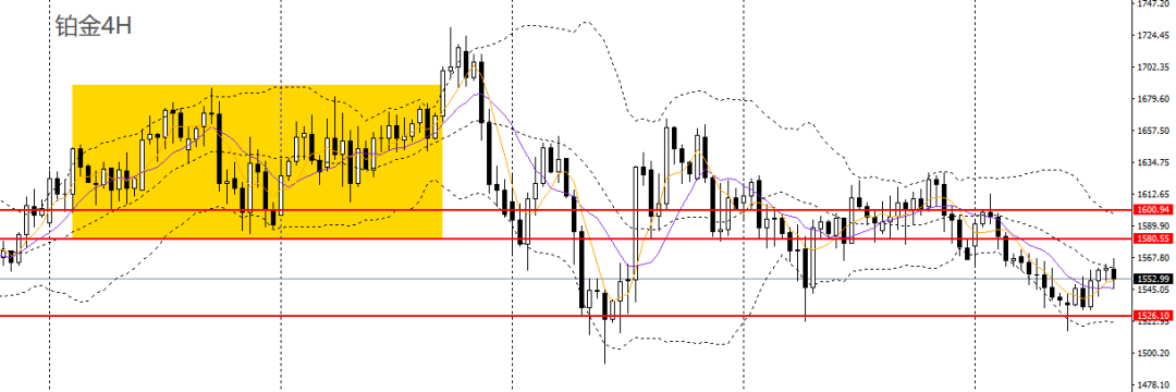 铂金昨日小幅回升,日线RSI位于50左右,4小时多次回踩1520一线支撑,尽管继续守稳上方,但并不属于典型的多头形态,如无法有效升破1580,多单建议离场。