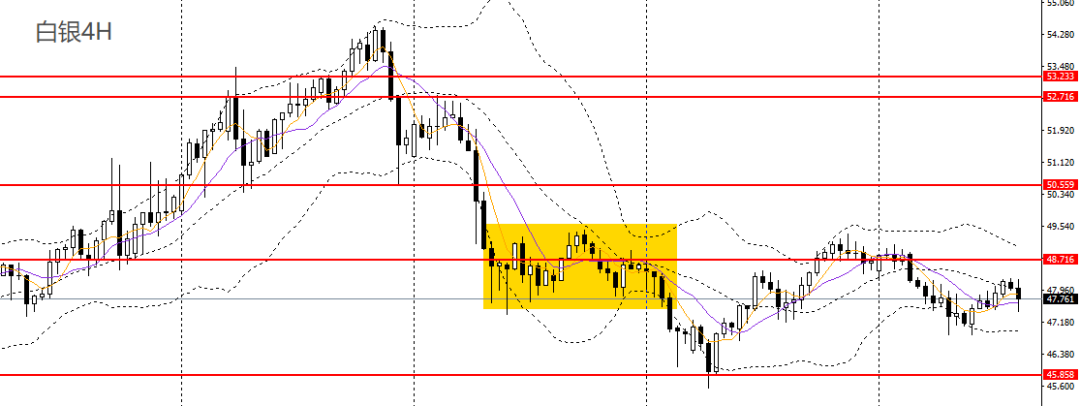 白银昨日收复周二跌幅,5日、10日均线交错粘合,4小时重新站上47关口,但多头力量仍有限,多单建议谨慎持有,稳健者可保持观望。