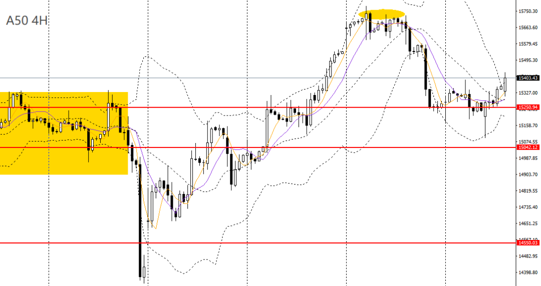 A50昨日收看涨吞没阳柱,4小时下探15000关口支撑企稳,短线趋势再度转多,如维稳于15200上方,多单仍可持有,后市可看多至15500。