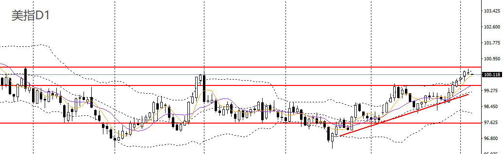 美元指数收十字星,今日亚盘跳空下行,4小时多头动能减弱,100.30-100.50一带面临强压,如继续承压于下方,短线有望回踩100关口,如进一步失守100,后市预计将回踩99.70,99.50。