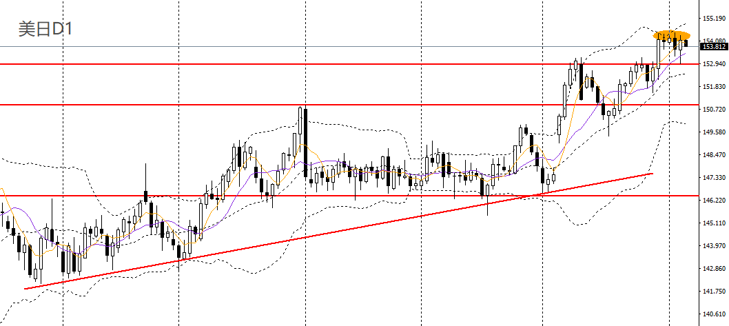 美日昨日反弹,回踩10日均线,日线RSI位于50上方,4小时回踩153-153.20一带企稳,但多头动能有限,多单建议见好就收,稳健者可暂时观望。