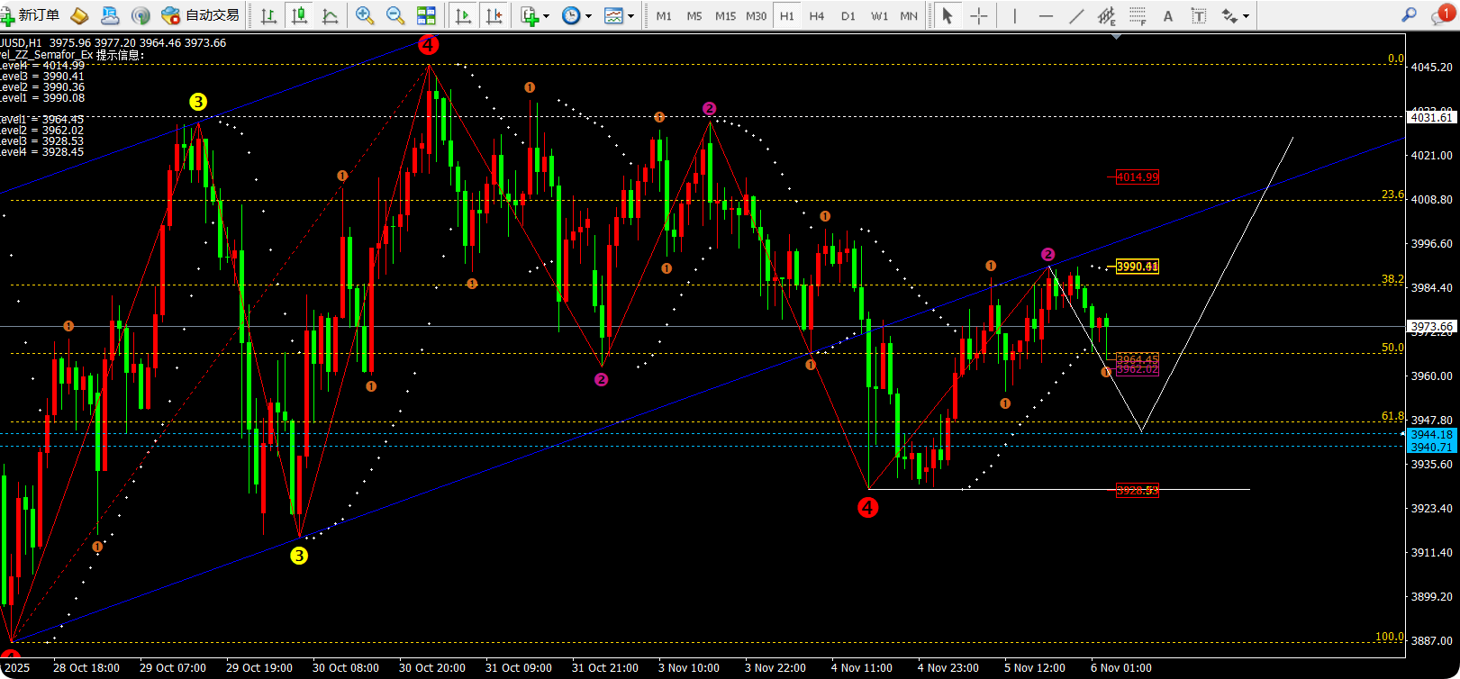 从昨日走势看:目前的3930-33是底部支撑,其次是3942一线。而昨晚回撤的低点3955-3960是当前的小支撑,阻力是目前的3980-3990一线。