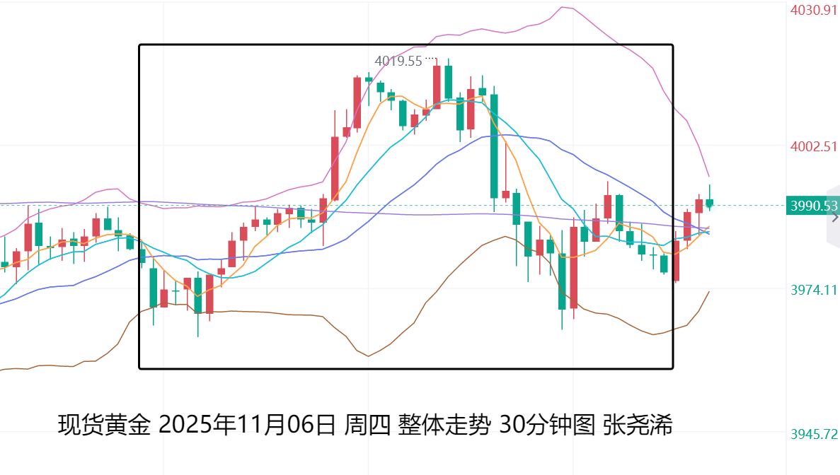 上交易周四(11月6日):国际黄金先涨后回撤倒垂收平,仍处于30日均线下方,但也整体保持震荡,基本面也未有进一步的利空,故此,短期来看,还是将维持震荡待回升的预期发展。