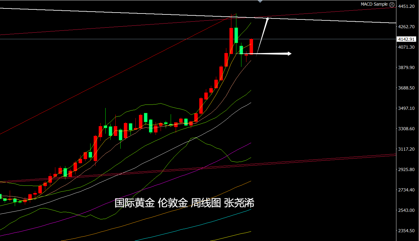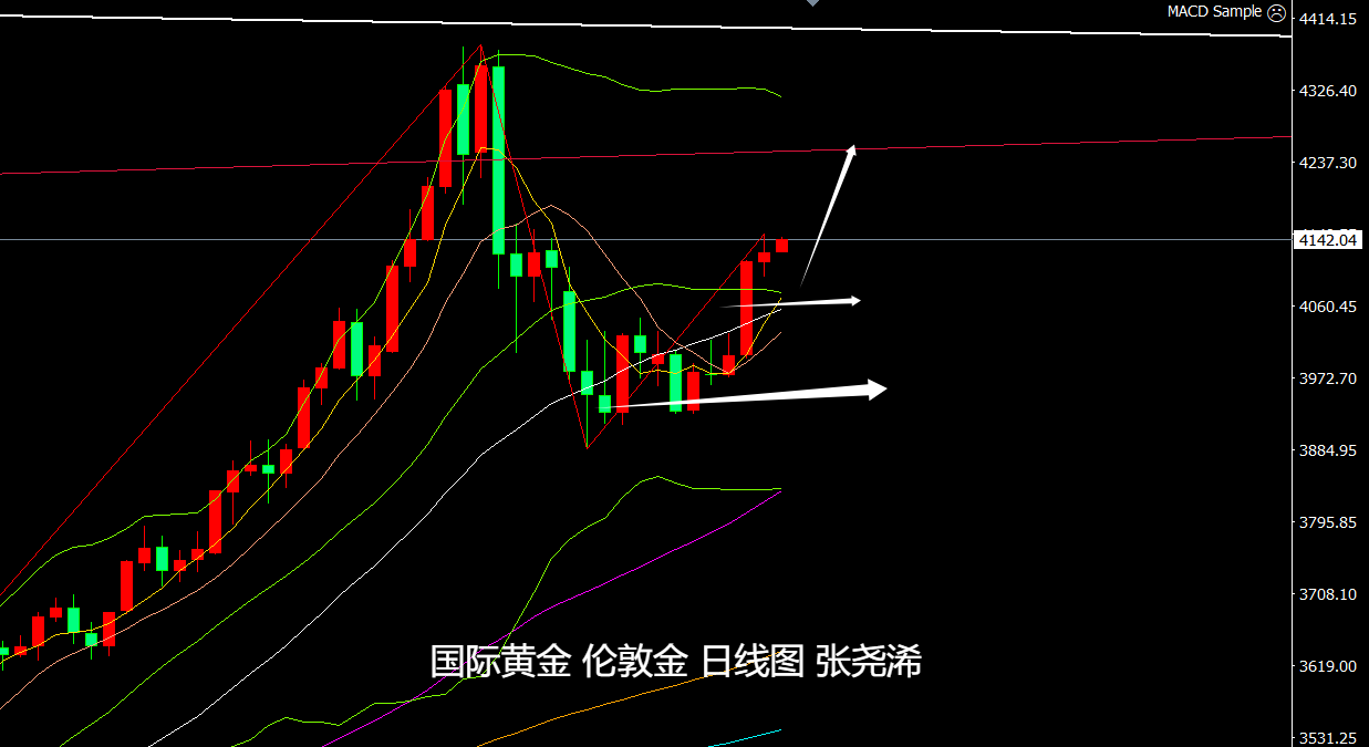 但上周未能进一步跌破10周均线支撑,并收取止跌形态,暗示的本周有止跌反弹重回5周均线上方转强再攀升的倾向的得到验证;布林带也再度向上延伸,5-10周均线也转为支撑,目前将继续维持低多操作,待上看4340美元或更高位置。