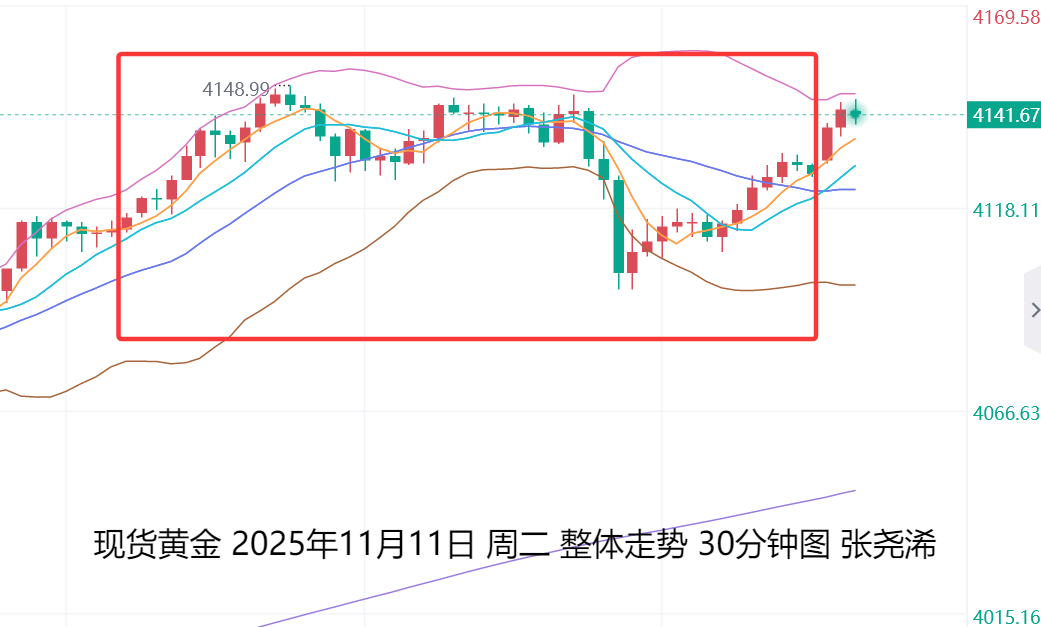 上交易日周二(11月11日):国际黄金震荡收涨,虽有一定的反弹见顶预期,但仍在中轨等均线上方,多头占据优势,基本面上也无明显利空因素,故此,短期仍将继续维持看涨反弹,等待触及4250美元附近。