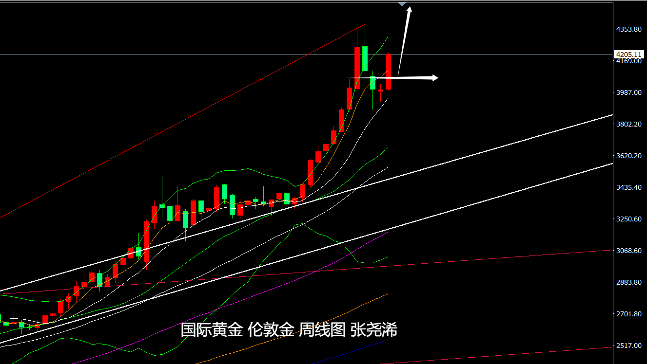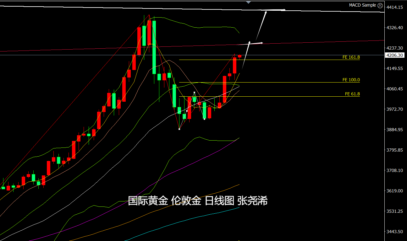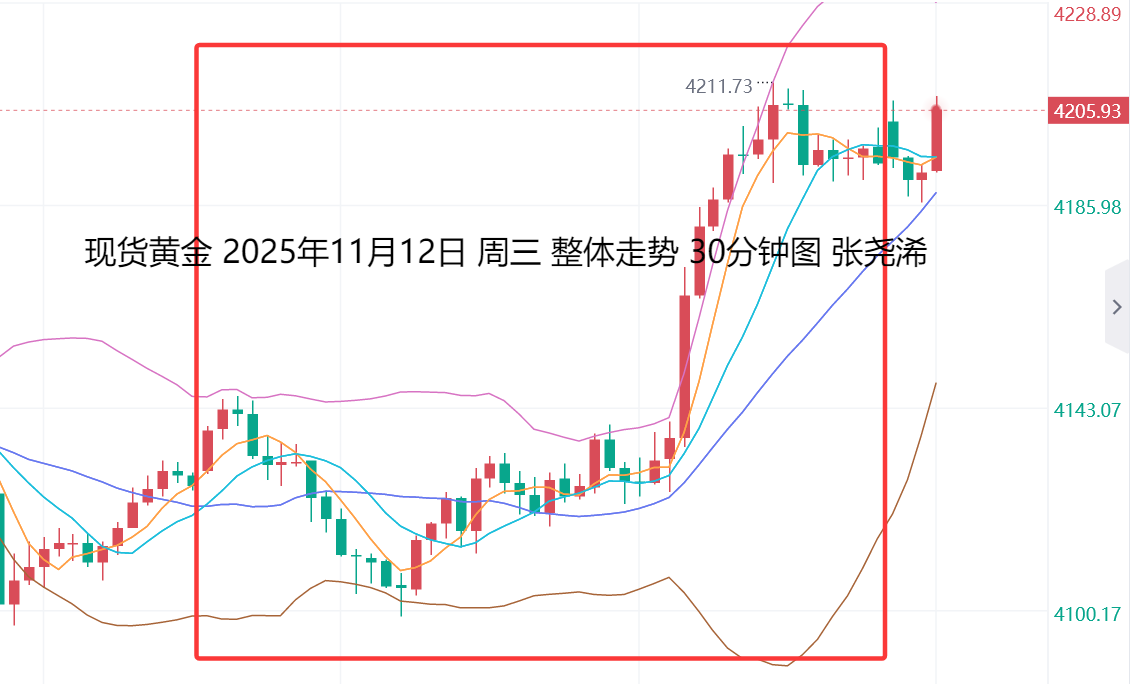 上交易日周三(11月12日):国际黄金如期继续反弹收阳,稳于中轨及30日均线上方,多头占据优势,后市将进一步等待触及4250美元或4400美元预期目标。目前来看,后续到年底走势,要么维持高位宽幅震荡,要么持续走强攀升。