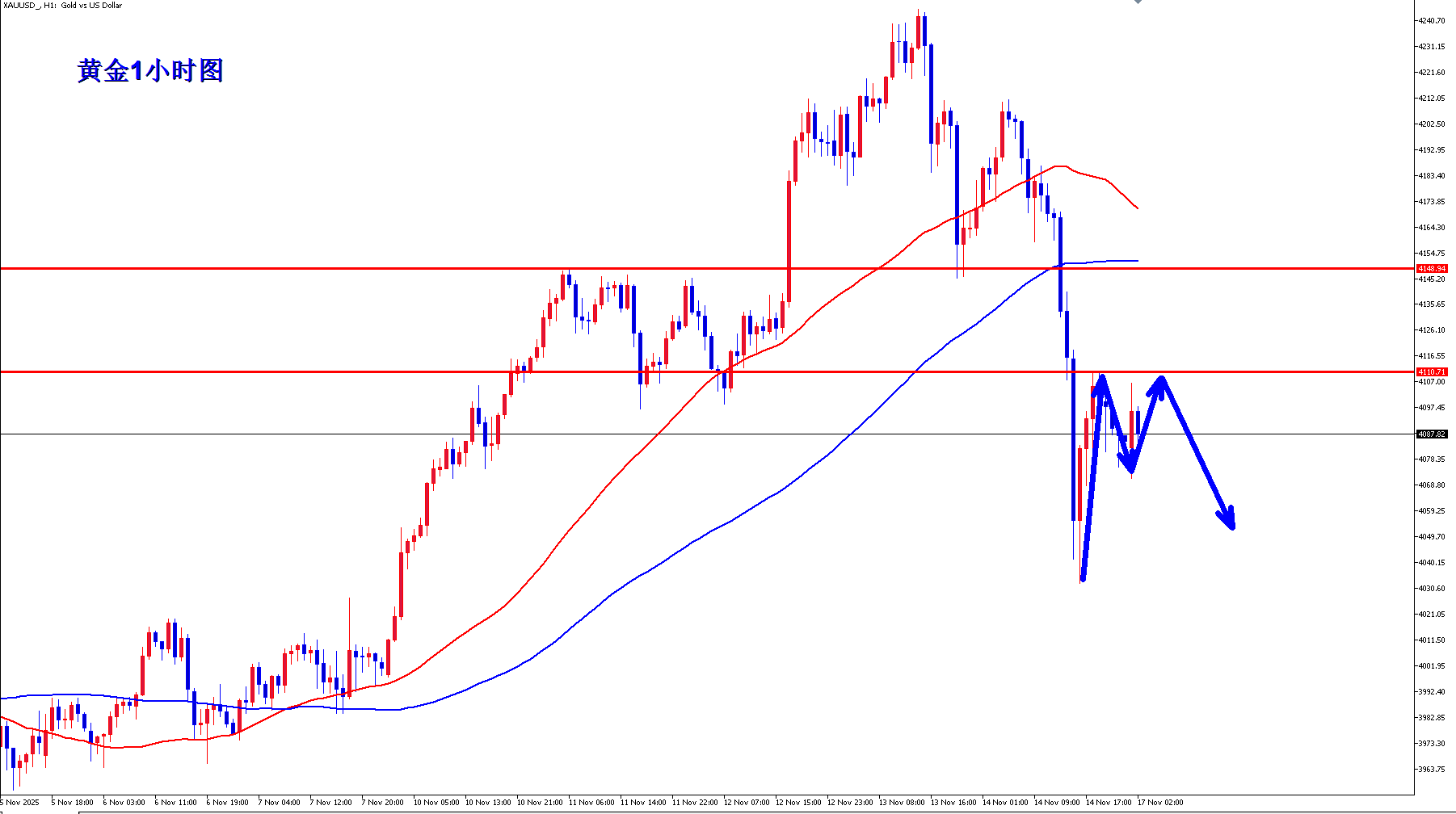 那么接下来说说今天的黄金,黄金早盘开盘之后小幅反弹不过继续高位承压再次回落,黄金短线来说4110一线已经形成了有效压制,黄金如果早盘反弹依然承压4110,那么黄金反弹就是属于极弱行情,那么下面可能还有一定的调整空间,不过即使黄金反弹稍微强势,黄金在4150下承压都还是1小时头肩顶结构,所以今天依然反弹高空为主。