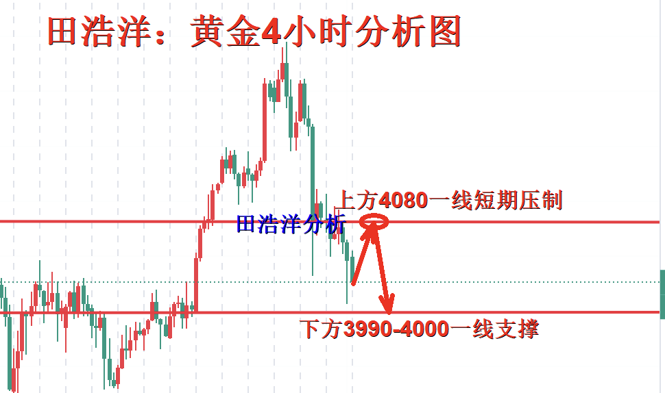 从4小时分析来看,下方我们先关注支撑3990-95附近,上方压力关注4067-4075一线附近,整体依托此区间保持反弹做空的节奏参与,中间位置一律多看少动谨慎追单,耐心等待关键点位进场。具体操作策略我会在盘中提示,及时关注。