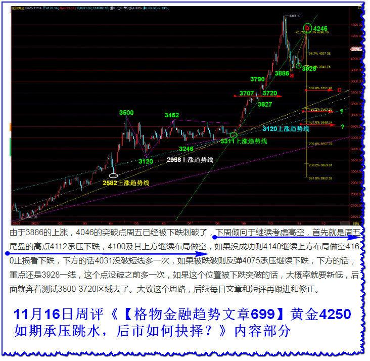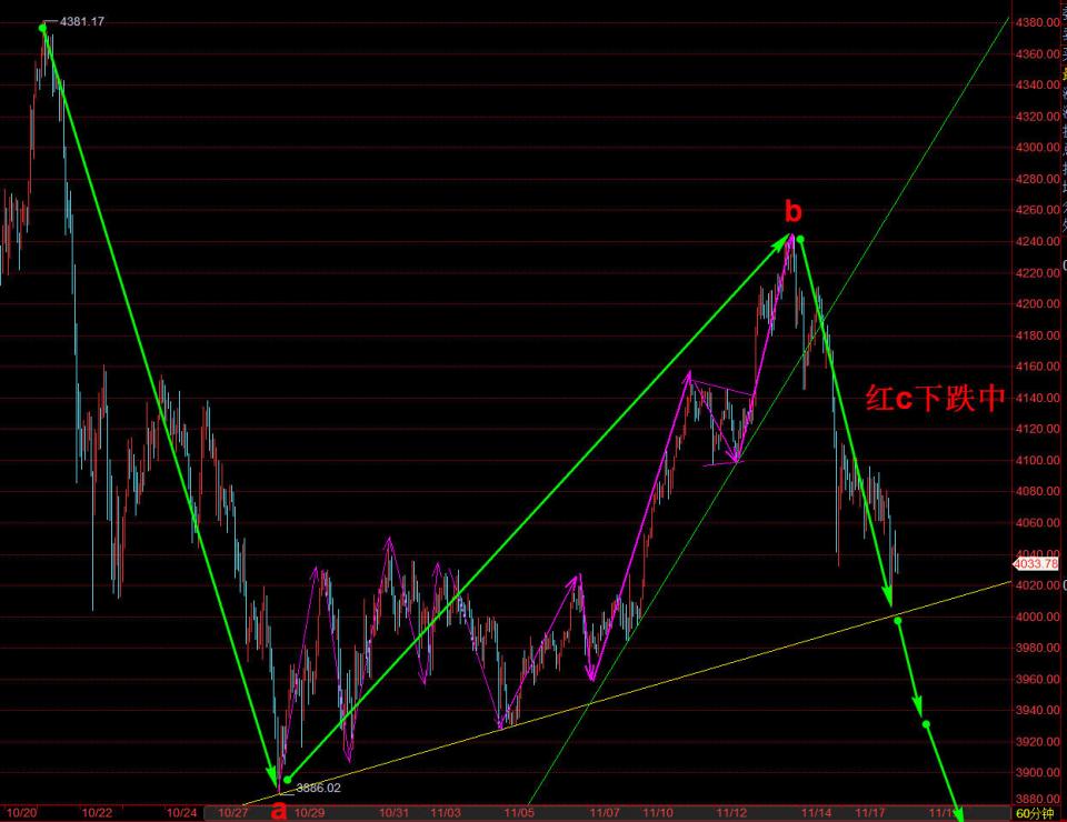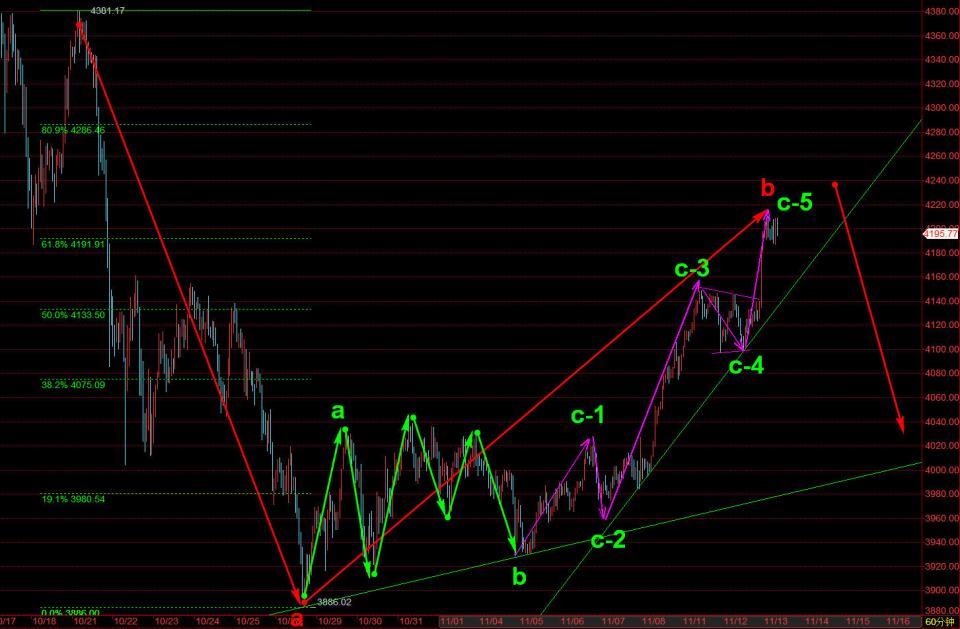 因此,上周四11月13日文章《【格物金融】黄金红b浪反弹尾声,注意再度酝酿下跌》我们将3886的上涨的这个红b浪当3-3-5的平台模式处理,得到的结论就是红b的c-5尾声,行情酝酿下跌。当日黄金4245一线展开了下跌。周五文章提及4212承压继续下跌,最终黄金4211一线一路下跌到4032一线。