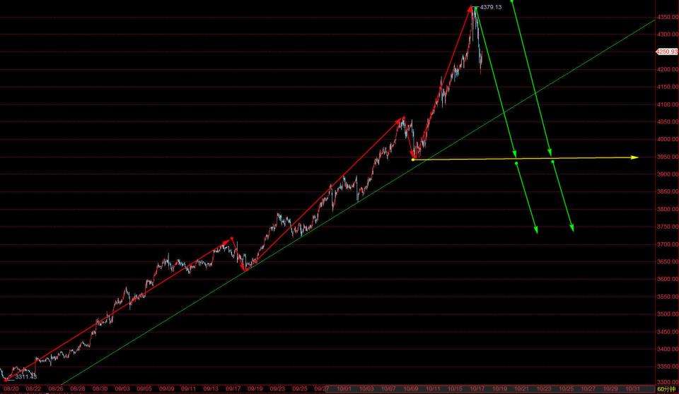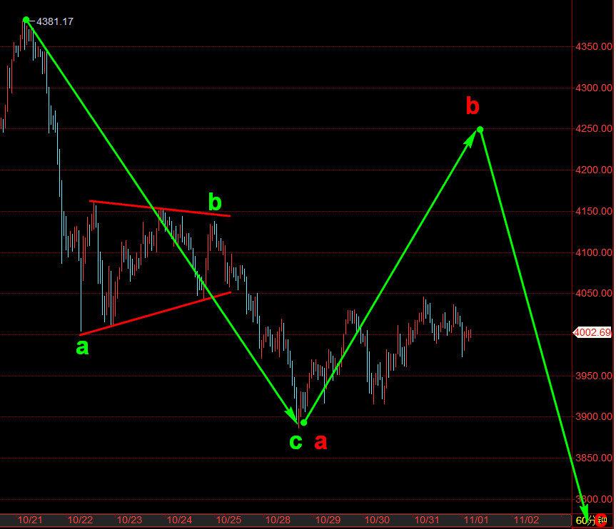 昨日黄金开盘4084.65美元,最高4109.72美元,最低4007.00美元,收盘4045.30美元,报收中阴线。10月中之后我们看黄金4380承压下跌,之后黄金大跌了近500美元。当黄金跌到3890之后我们强调这个反弹,关于这个反弹,我们11月2日周评强调,以4046为分界,如果突破的话,黄金就是强势红b浪反弹,那样的话黄金就有望冲击4250再进入红c浪下跌。