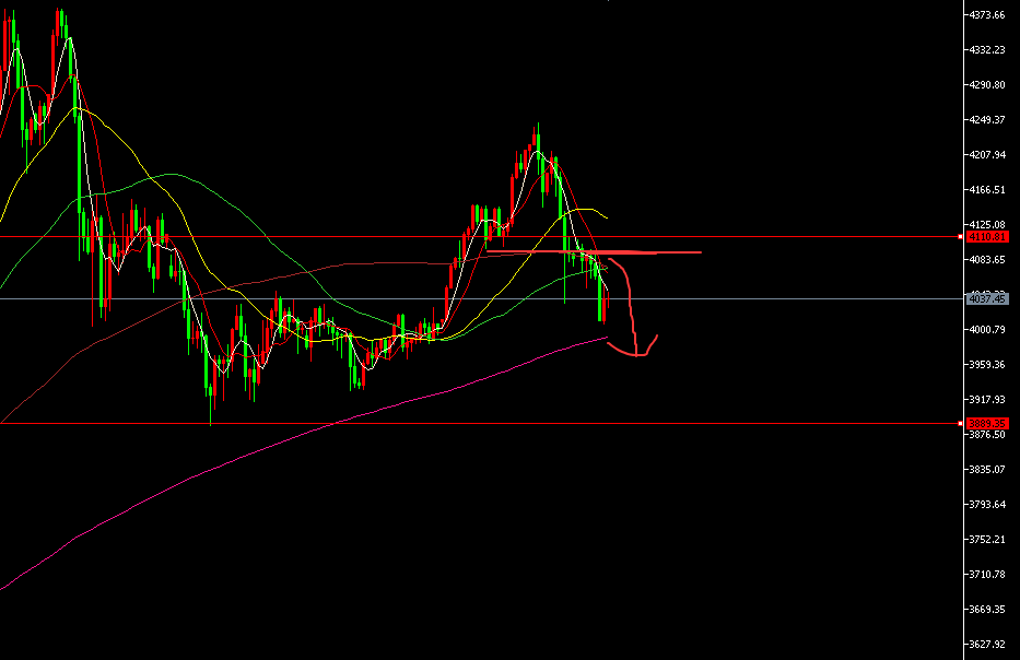 4小时图以4245作为调整浪高点,直线下挫后开始进入缓慢迂回震荡下跌,昨日两次拭擦4100附近承压,局部受阻后再蓄势破低,今日短线依托4100做为防守点继续看空即可。操作上亚盘4055-4060附近先行看空 防守4080.50目标看3980-3960减个仓再下看。波动基数大,短线的空间也大,波段性目标继续看破3887低点。