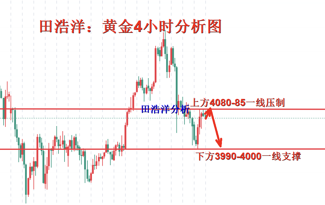 从4小时分析来看,下方我们先关注支撑3990-4000附近,上方压力关注4080-4085一线附近,整体依托此区间保持反弹做空的节奏参与,中间位置一律多看少动谨慎追单,耐心等待关键点位进场。具体操作策略我会在盘中提示,及时关注。