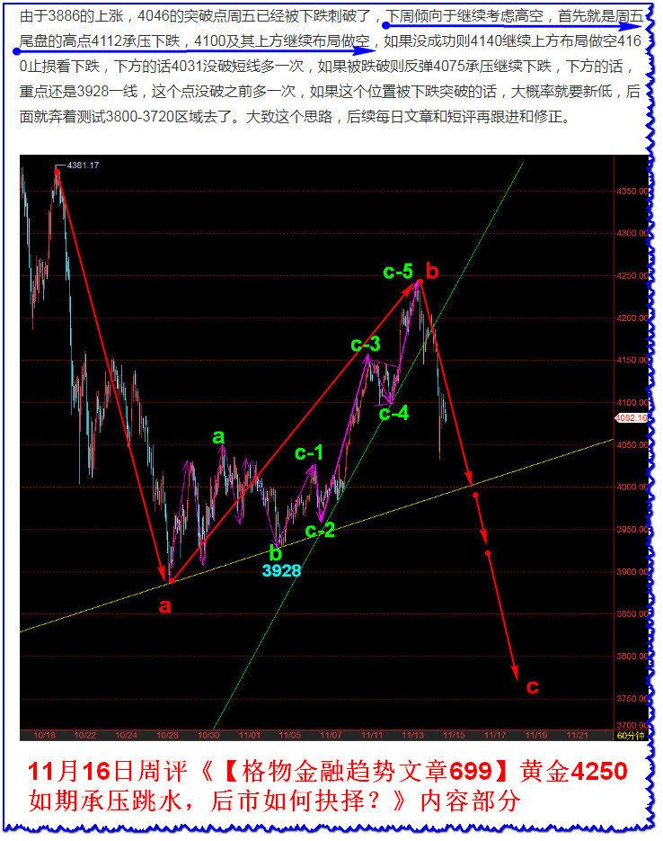 昨日黄金开盘4045.33美元,最高4082.40美元,最低3997.90美元,收盘4067.30美元,报收下影线小阳线。上周四11月13日文章《【格物金融】黄金红b浪反弹尾声,注意再度酝酿下跌》我们将3886的上涨的红b浪当3-3-5的平台模式处理,得到的结论就是红b的c-5尾声,行情酝酿下跌。当日黄金4245一线展开了下跌。上周五文章提及4212承压继续下跌,最终黄金4211一线一路下跌到4032一线。11月16日本周周评文章《【格物金融趋势文章699】黄金4250如期承压跳水,后市如何抉择?》提及黄金4112承压继续下跌,4100及其上方布局做空,后市争夺3886-3928的连线。最终黄金4109一线下跌,昨天最低到了3997.90一线。