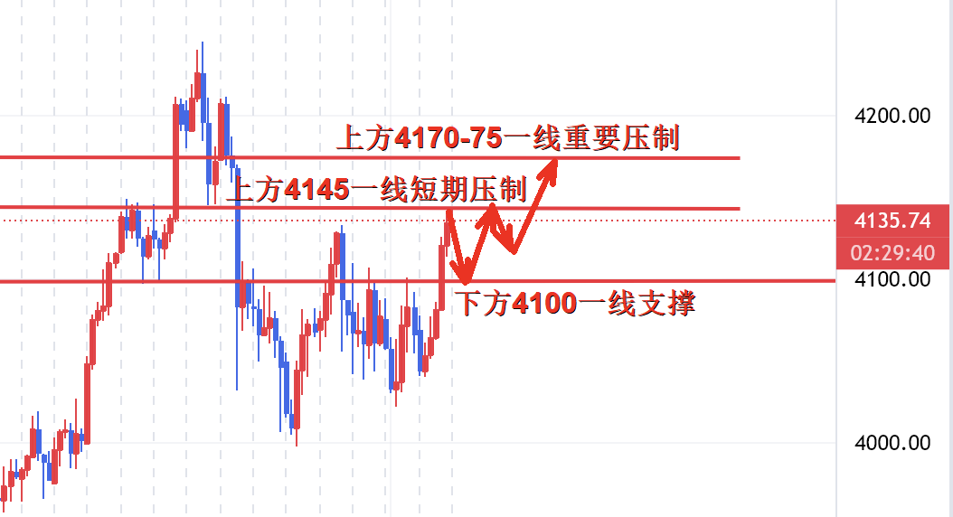 从4小时图走势来看,上方关注4145一线短期压制,重点关注4170-75一线重要压制,下方关注4120-25一线支撑,技术上震荡更倾向于调整回落做多,我们耐心等待关键点位进场。具体操作策略我会在盘中提示,及时关注。