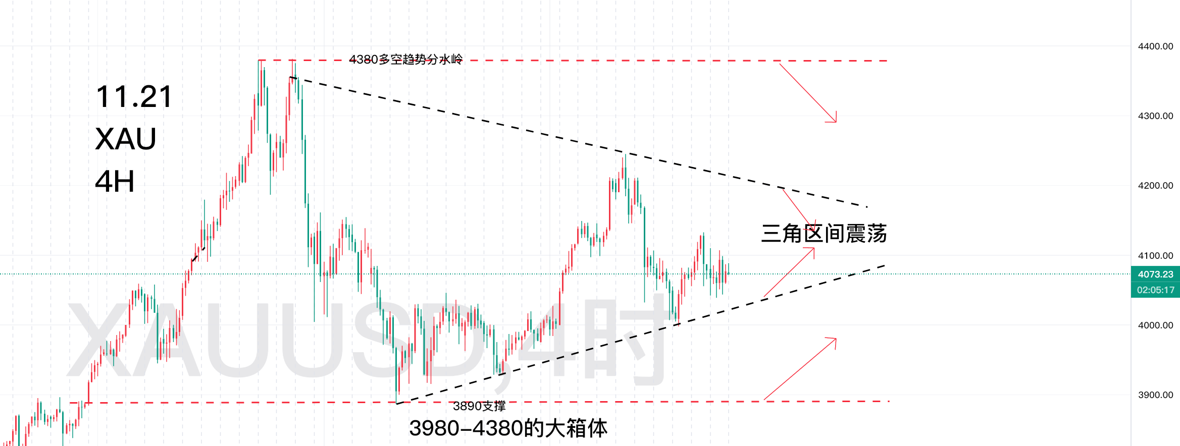 第一:昨日观点给出黄金市场将会在三角收敛和箱体震荡,两种级别的区间主打一个震荡走势;这种走势符合预期!昨日的拉升,将金价重新拉回区间之中!这也验证了一个震荡是有效的!