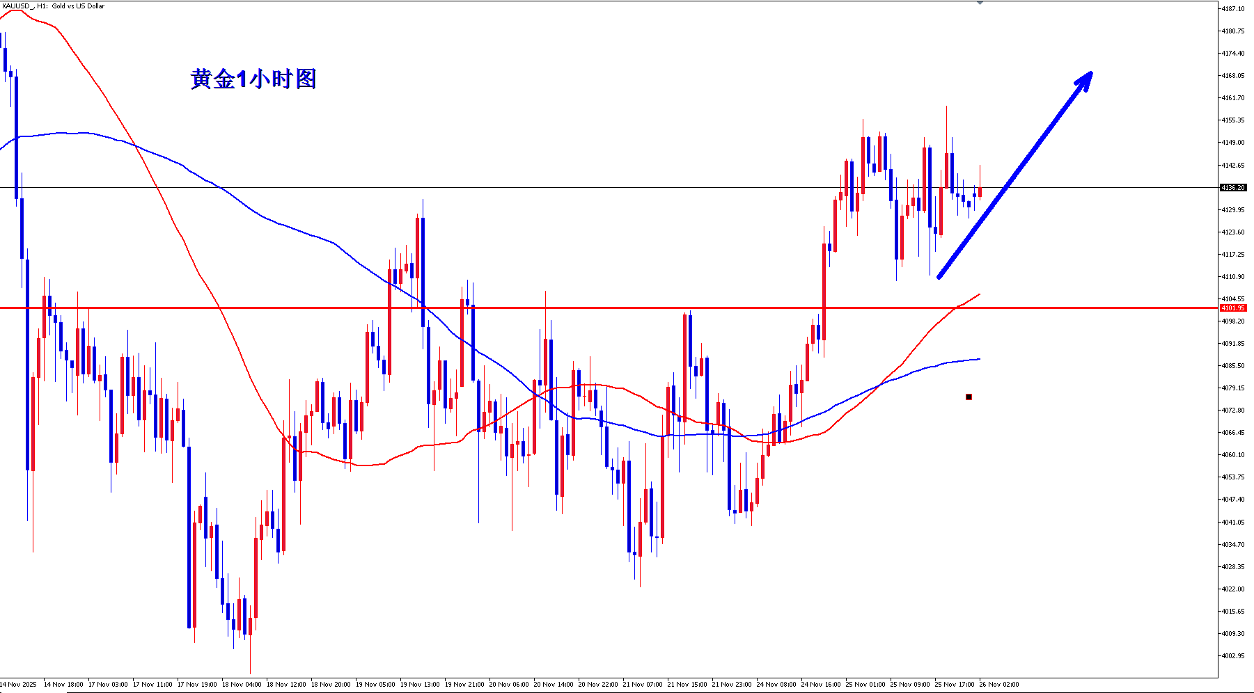 黄金1小时均线继续金叉向上的多头排列,开口张大,黄金多头向上还有上涨力度,黄金1小时回落低点依次抬高,黄金始终坚守住4100上方运行,黄金只要不破4100,那么黄金多头还有望再次发力,黄金回落4100上继续逢低多。