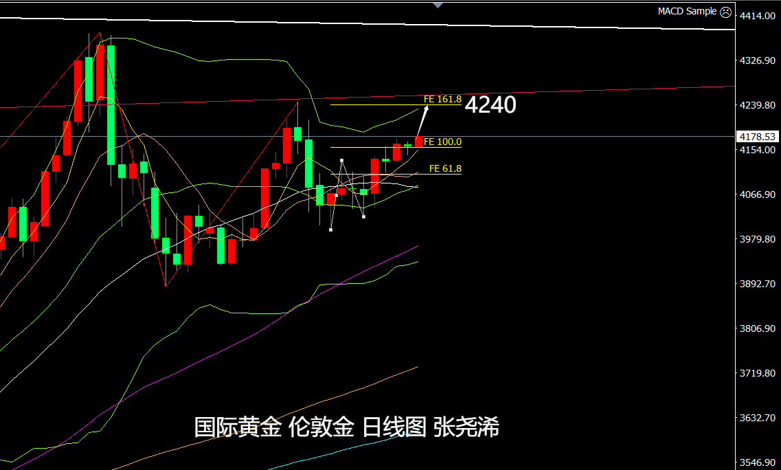 日图;金价近期保持中轨支撑上方持续震荡调整,低点上移,目前也再度持稳于30日等均线上方,布林带也开口向上延伸,多头占据优势,前景看涨预期加大,下方则关注5日均线及中轨线支撑等继续看涨为主,短期上方等待再度上探4240-4260美元或4380美元目标。