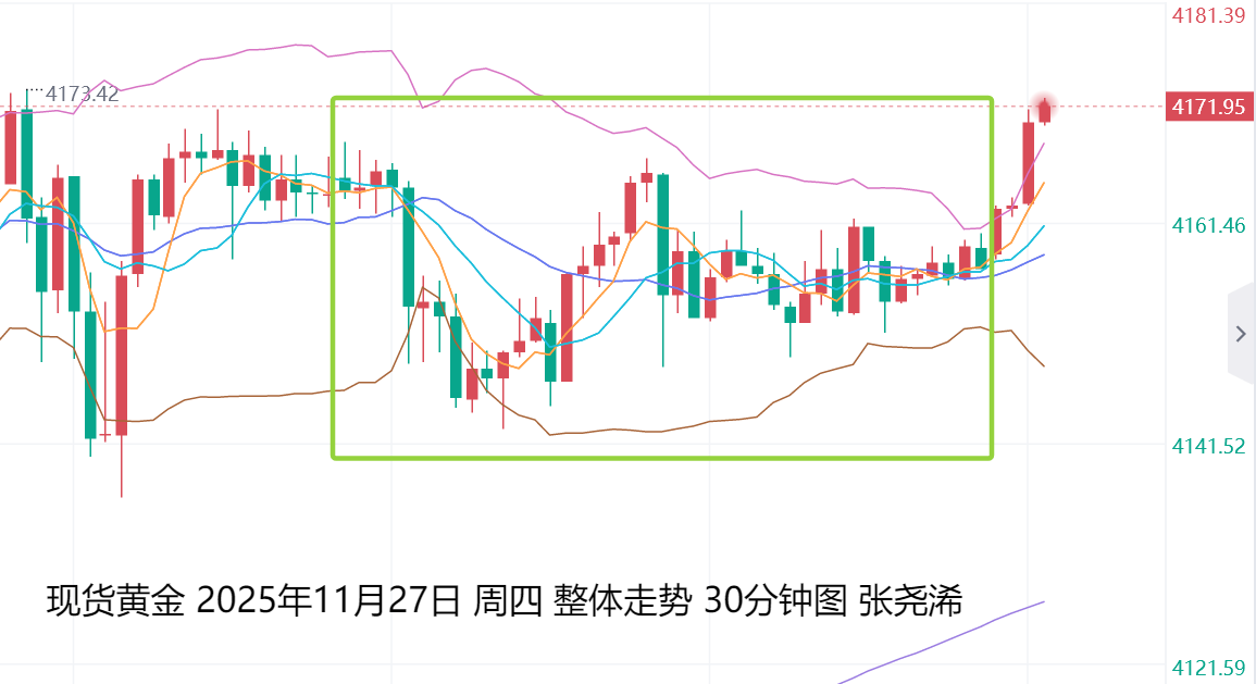 展望今日周五(11月28日):国际黄金开盘延续昨日回升之力先行反弹走强,美元指数早盘表现走弱,也对其产生一定支撑,并且,昨日普京表示和平协议目前尚无最终版本,美军B-52H轰炸机在加勒比海进行攻击演习等,也增强了一定的地缘局势避险需求。整体来看,金价短期将维持反弹趋势不变。操作依然偏向低多为主。