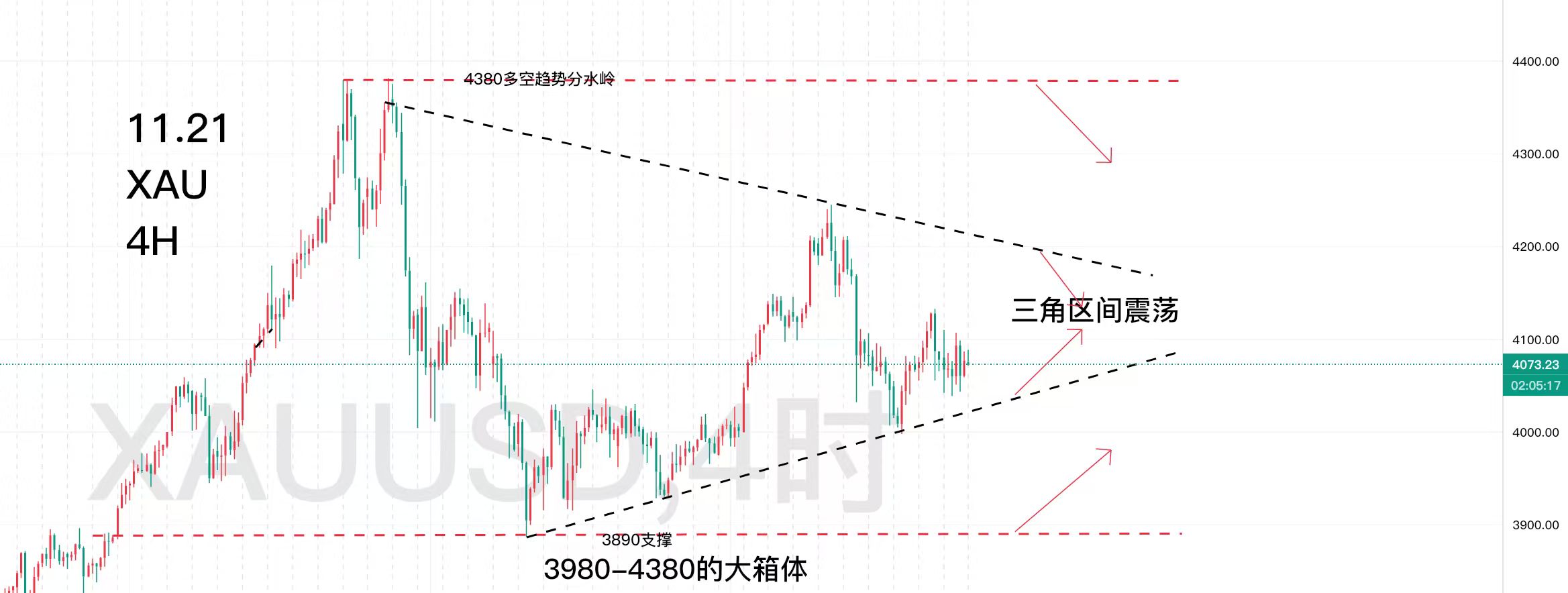 第二:技术面之中,相对简单清晰一些!因为三角收敛震荡之后,下一个就是箱体区间,就是4380-3890的箱体;这个箱体简单,破位4380的位置,企稳多头趋势;破位3890的位置,空头趋势确立!