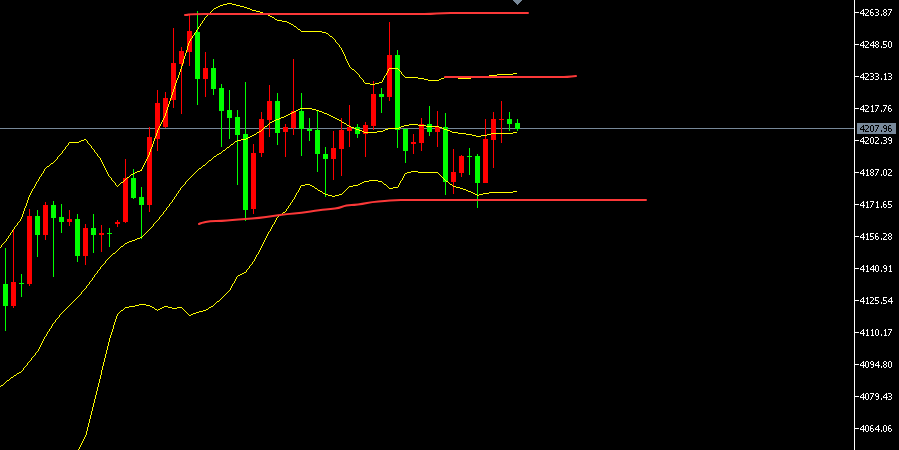 4小时图昨日下探布林道下轨处启稳再反弹至中轨附近收盘,目前宽幅区间4260-4160等待打破,小区间则是进一步收缩至布林道上下轨之间4230-4165.短线来回拉扯,暂时看不出强弱,等待放量突破,短线操作还是围绕上轨处4220-4230分别短空 防守放在4250上方看至下轨处4170减个仓破位再下看,短线空单结合空间的释放破位,后市可能会变成波段性的调整空单。目前短线来回拉锯。超短线适当落袋再下移保本下看。