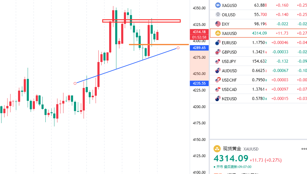 隔夜美国11月份非农数据姗姗来迟 ,其中就业人数稍微高于预期的5万人报6.4万人,失业率从4.4%上升至4.6%,薪资水平也是小幅的下降,整体数据稍显疲软,虽然失业率回升很大部分原因是政府停摆所致,但是实际状态如此,也是印证了上周相对温和的美联储降息,继续给后续降息提供了支撑,另外同步公布的美国11月份零售销售数据也是表现疲软,整体是给到黄金支撑,上个交易日黄金早盘小幅反抽在4317附近如期回落,亚欧盘最低回踩4271附近企稳走反复,我们也是提示大家非农前的回踩大概率是给非农腾空间,非农数据之后站稳4300关口一路反抽到4311附近然后一波迅速回踩4300关口确认支撑之后加速拉伸一度触及4334附近然后再度走反复,最低回踩4291附近然后再度回升,短期反复的格局还将维系,主要是目前处于历史高位,虽然有多重利好支撑,但是市场恐高情绪不断在增加,所以我们在操作上也不宜过分激进,上个交易日跟大家分享的先空后多思路也是完美对线,日内继续保持。