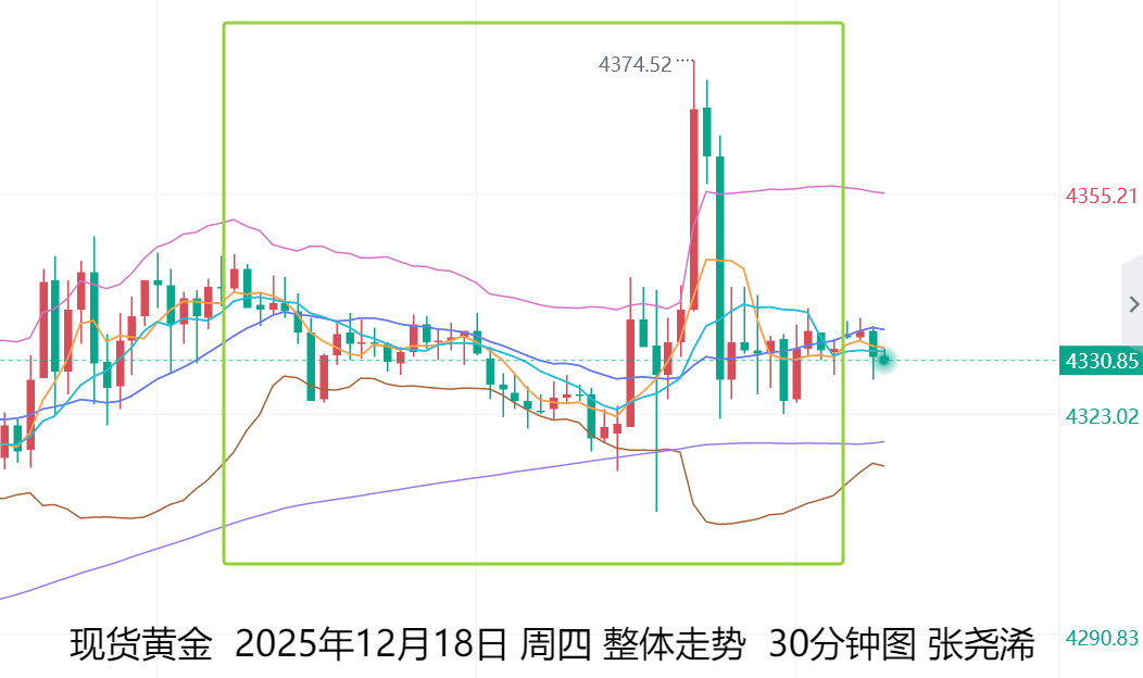 具体走势上,金价自亚市开于4337.99美元/盎司,亚欧盘时段先行维持震荡下移模式,延续至美盘时段,走势频率及幅度开始加大,先是走低22点半时段录得日内低点4308.66美元,之后又迅速反弹,连续回升,于次日0点时段录日内高点4374.14美元,之后又回落收复涨幅,并陷入4322-4340美元区间内持续盘整,最终收于4332.42美元,日振幅65.48美元,收跌5.57美元,跌幅0.13%。
