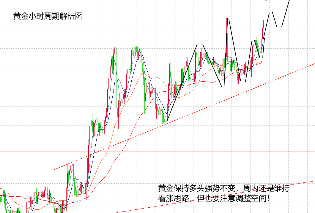 跟大家回顾一下上周强调的思路,上周讲过,在多头趋势不变的情况下,黄金依旧看涨,并且强调上方看到4355,4385,但另外要注意强势中的调整空间,暂时黄金是绝对强势,但并非单边走势,所以,也可能随时走出回落力度。因此,上周的交易即要做顺势上周空间,也要做高位回落力度,按照这个想法做,上周的利润也不错。早上开盘,黄金继续上涨,在地缘消息的影响下,再次体现出避险需求,趋势作用明显,本周依旧维持前期的看法不变,保持多头趋势看涨,但随时注意调整的空间,所以,主思路还是低多,辅助看法是找准高点做空。目前黄金收盘在4370附近,在相对价位中,目前是绝对的高位,上周高点在4375,历史高点在4385,所以,剧烈关键点也就差一点点,那么,周初就关注上方高点的得失,关键点位不破,周内肯定有调整空间,调整力度不大就看震荡,调整力度过大,有可能会在节前有市场抛盘行为,加大了调整的风险,所以,本周黄金目前是强势,但也要谨慎对待随时的调整空间。周内的下方支撑在4335,4310,跌破4310或看4250。对于今天行情来讲,黄金直接走高不追高,下方关注回来支持4335支撑,上方关注4385这4400两个点位压制,尽量在关键点位交易。