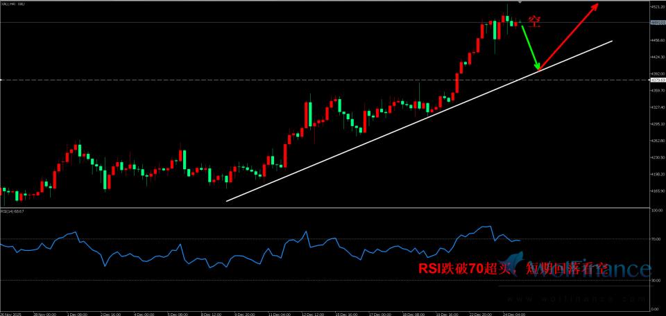 星期三(12月24日)黄金日内美盘初期金价高位震荡回落,市场承压走低,。现货黄金在流动性偏薄的节前时段放大波动,盘中一度刷新历史高位至4525.70美元后转入高位整理。当前市场的主线并不复杂:一边是年末资金落袋带来的短线获利了结,另一边是美元偏弱与地缘不确定性共同托底,使得黄金更像是在“高处换手”,而不是趋势被彻底扭转。黄金今年的表现非常引人注目:年内累计涨幅超过70%,接近创下自1979年以来最强的年度涨势。驱动因素主要来自三条线索的叠加。其一,地缘风险与全球不确定性并未消退,避险需求时强时弱,但在关键时点会迅速把资金推向黄金这类“无需信用背书”的资产。其二,美元走弱抬升了以美元计价资产的名义价格表现,同时也降低了非美资金配置黄金的汇兑门槛。其三,货币政策环境更偏“宽松方向”,使得持有无息资产的机会成本下降,资金愿意为确定性更高的对冲属性付费。