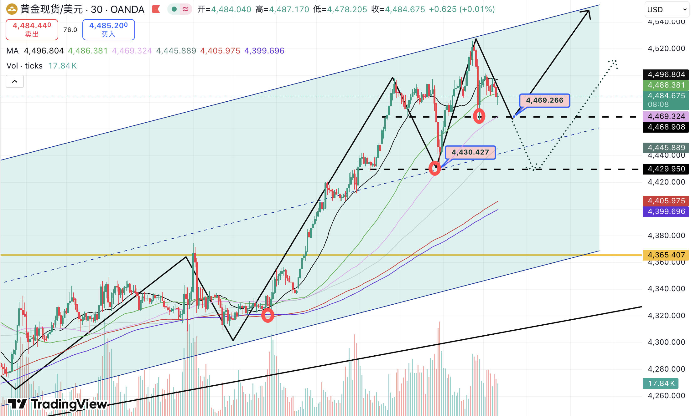 第二个可以介入多单的点位在4460,这里是3小时级别布林带中轨的支撑,如果跌破4460,则将走向更深度的回调(4426),当然目前看概率不大。