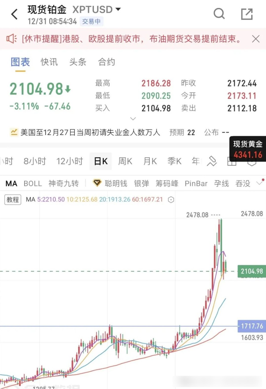 今天无论如何冲高,都不能再破昨天高点,不能站上4400大关,否则多头又要慢爬重启了!下方4300大关一旦击穿,行情继续考验多头生命线3886以来的上涨趋势支撑!因此,马上阳历年,稳健起见观望,节后再战!杠杆产品,激进则冲高以阻力区域为压制分别参与空头,关注4300大关破位情况,下破前可继续短多,严格止损!积存金等非杠杆产品,耐心等待,破4300有更好的位置,不破等,也不差这几天;这种产品,短线没必要折腾!实物,持有就行!
