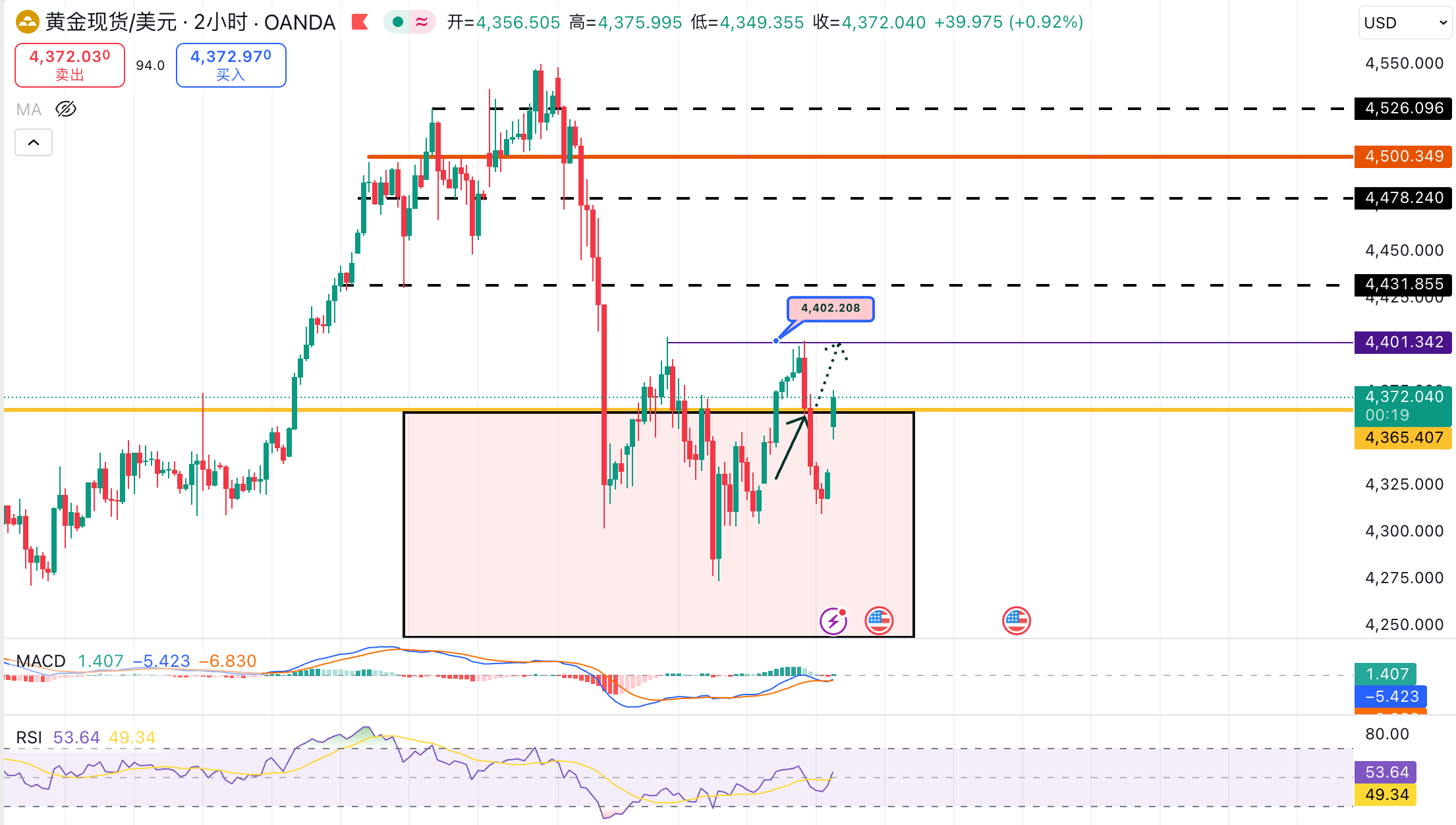 从2小时图看,金价在前期急跌后进入区间修复震荡,当前运行于4350–4400震荡箱体内。下方4350/4365 一线为前低密集成交区,支撑作用明显;上方4400-02属于箱体上沿与前高压力,短线仍存在抛压。